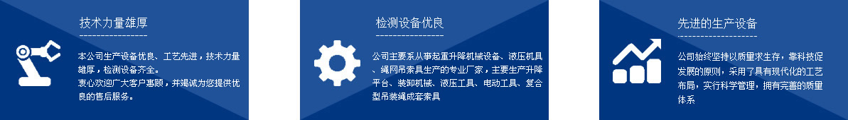 泰州市如意機械設備有限公司,座落在中國海軍誕生地江蘇泰州市,緊連328國道,東有鐵路相連,同時有滬寧、寧通高速公路相交,地理位置十分優越,自然環境得天獨厚。 本公司系從事起重升降機械設備、液壓機具、繩網吊索具生產的專業廠家,主要生產千斤頂、液壓拉馬、軸承加熱器、升降平臺、裝卸機械、液壓工具、電動工具、復合型吊裝繩成套索具、高強纖維柔性吊裝帶、起重鏈條成套索具、橫梁吊具、注塑繩、軟梯、安全帶、安全網等幾大系列、上百種規格的產品,廣泛應用于電力、油田、大型鋼廠、機電、化工、航空、冶金、機械、鐵道、造紙、港口、建筑等領域。 本公司生產設備優良、工藝先進,技術力量雄厚,檢測設備齊全,其中升降平臺、千斤頂、吊具、加力扳手、液壓矩扳手經泰州質量技術監督局監督檢驗 ...[點擊詳情] |